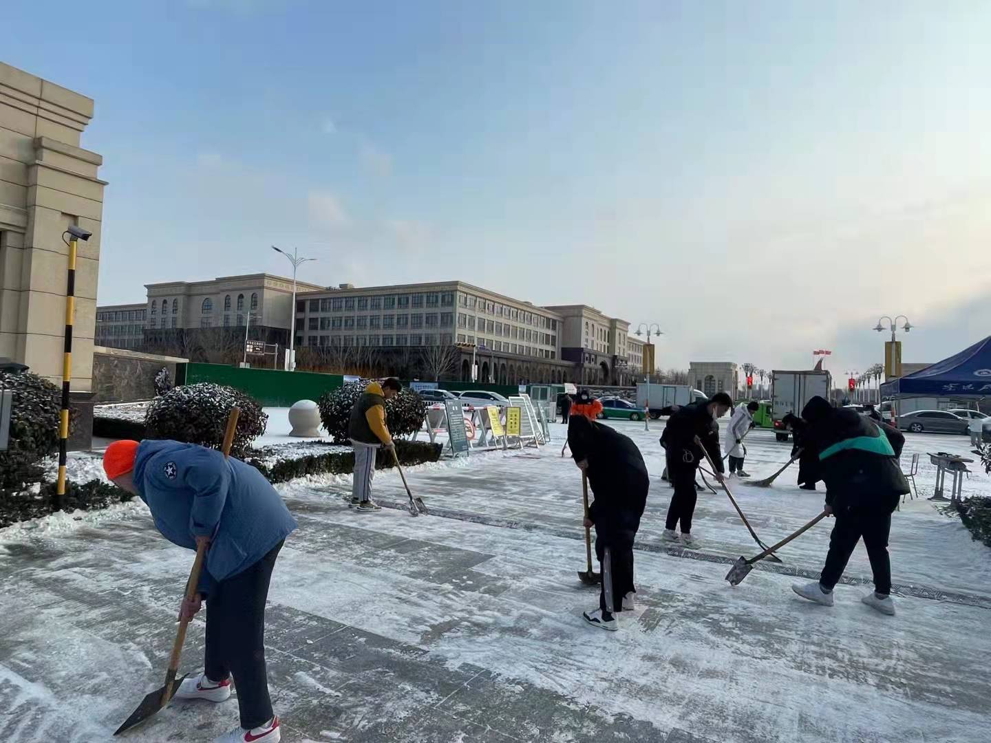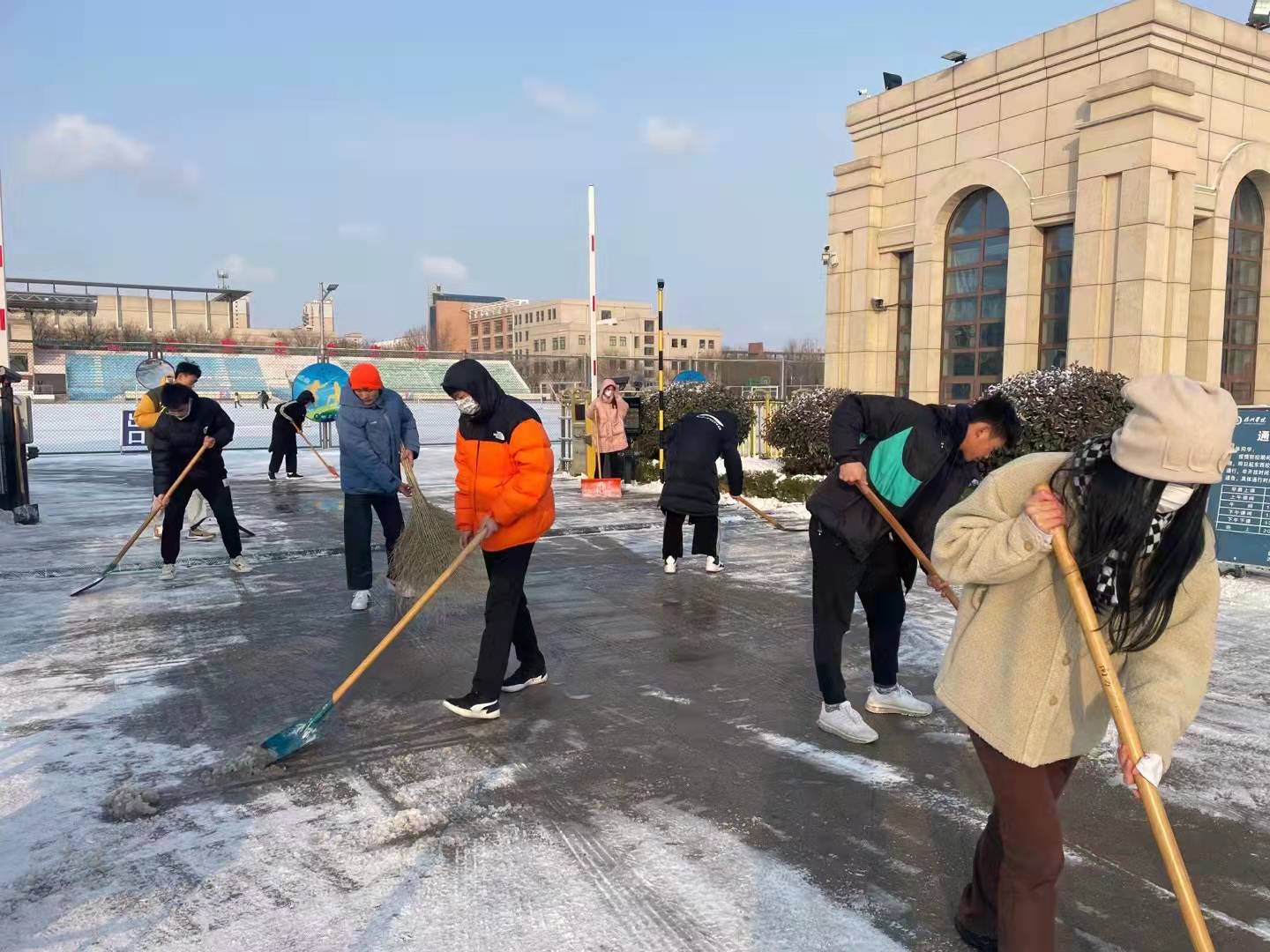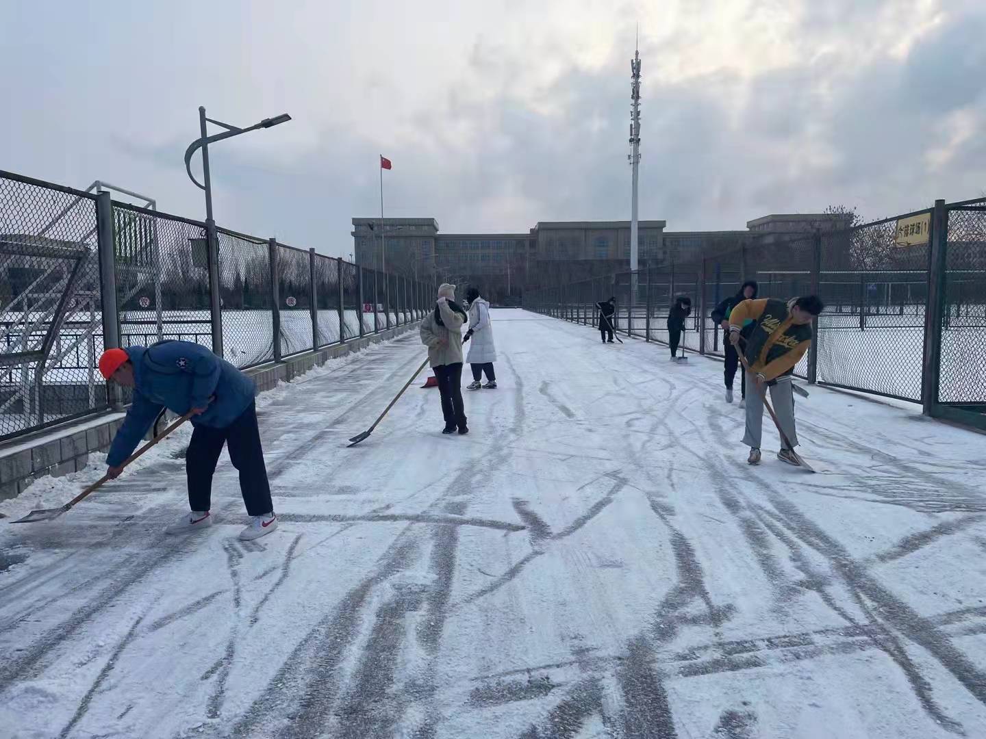 2021年12月24日,伴随着凛冽的寒风,气温骤降,白雪覆盖了整个校园,给校园道路交通带来诸多不便,扫雪任务迫在眉睫。为方便师生出行,学院老师和志愿者们纷纷拿起工具,对学校东门和体育馆体育楼前交通主要干道的积雪进行了及时清扫。