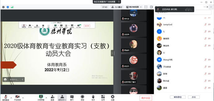 为推进体育教育专业2020级教育实习工作的顺利开展,更好的引导学生做好实习各项工作,9月2日晚,我院以线上形式召开2022年秋季实习支教动员大会,出席本次会议的成员有体育教育系主任李广文,学生工作办公室主任薛文辉,体育教育系副主任马晓娟及即将参加秋季实习支教的2020级体育教育专业的171名学生。会议由李广文老师主持。