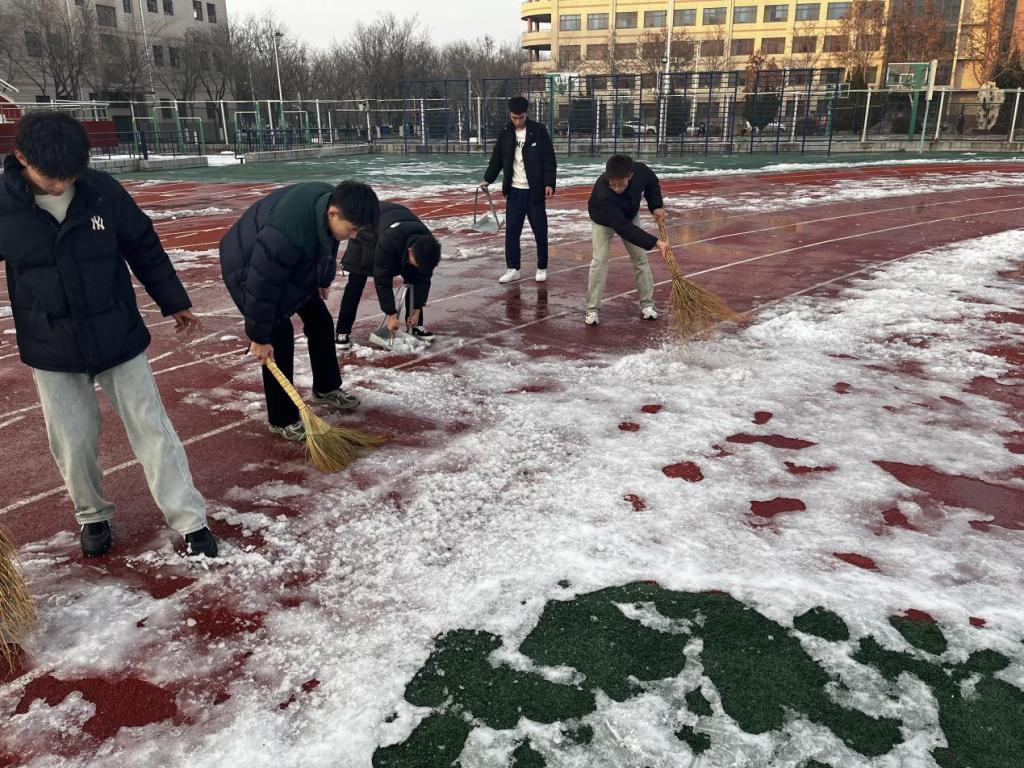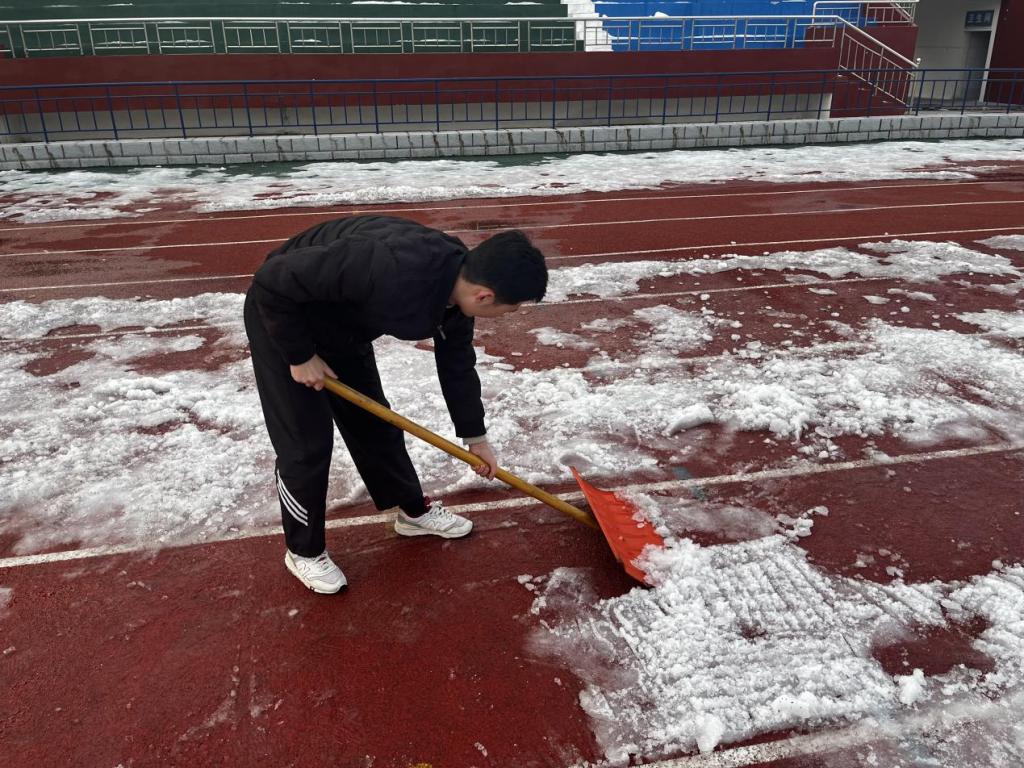 在活动现场,我院的同学们积极参与,齐心协力地将操场上的雪球和积雪清理干净。他们运用铲子、扫帚等工具,你追我赶,相互配合,展现了良好的团队精神。经过大家的共同努力,操场上的雪球和积雪被清理得干干净净,跑道恢复了往日的整洁。