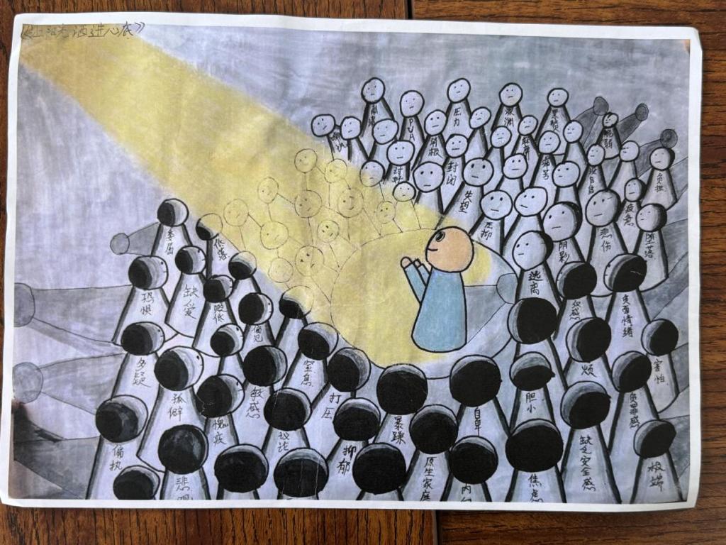 在这次活动中,每一位参与的同学都用画笔倾诉着内心的故事,色彩在纸上绽放,情感在笔触间流淌。通过绘画与描述作品背后的故事,让大家释放了积压的情绪,找到了内心的宁静与平衡。